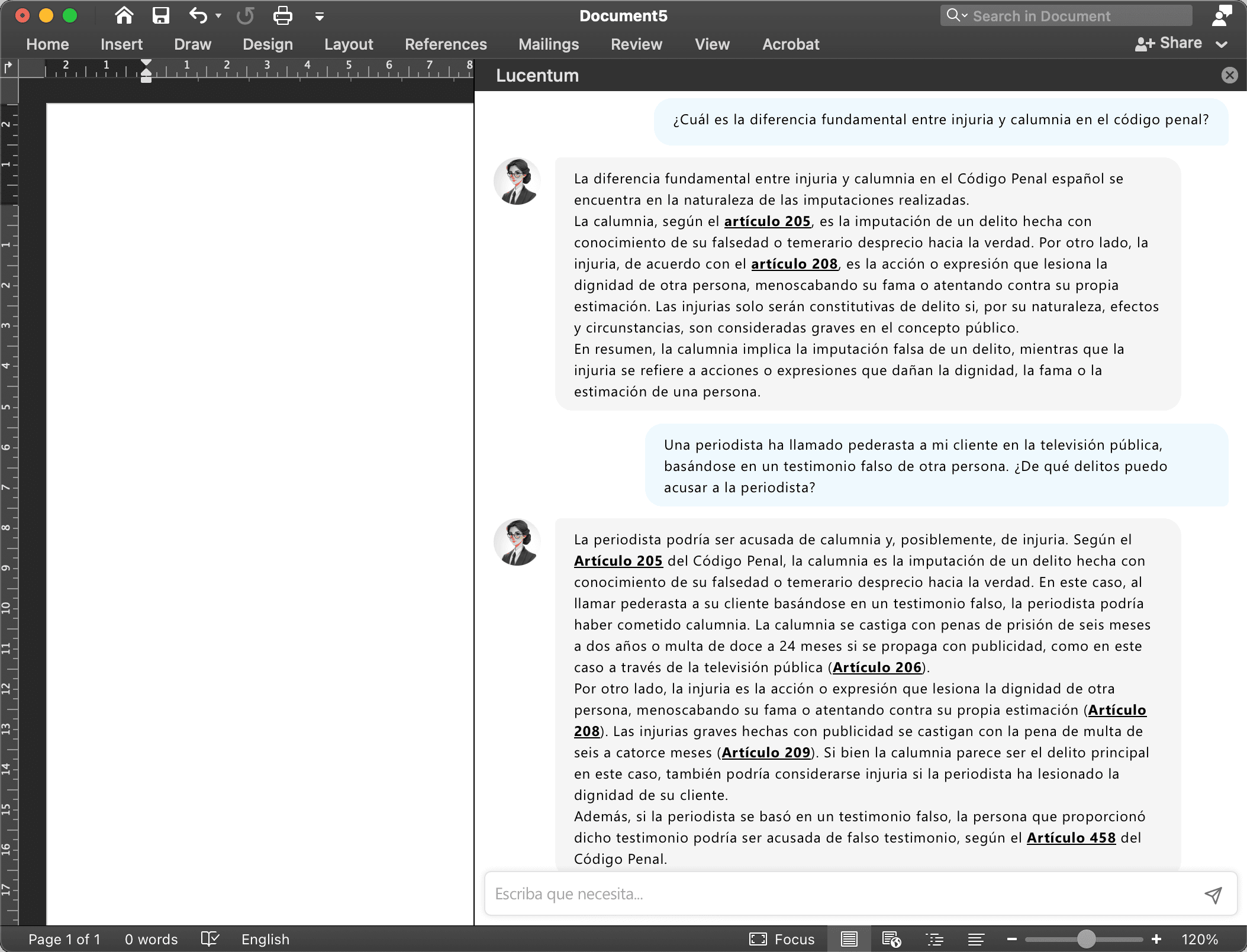 Lucentum es un revolucionario asistente legal hecho con Inteligencia Artificial. Responde consultas jurídicas, con referencias a los documentos legales relevantes, ofreciendo un resultado preciso y contextualizado.